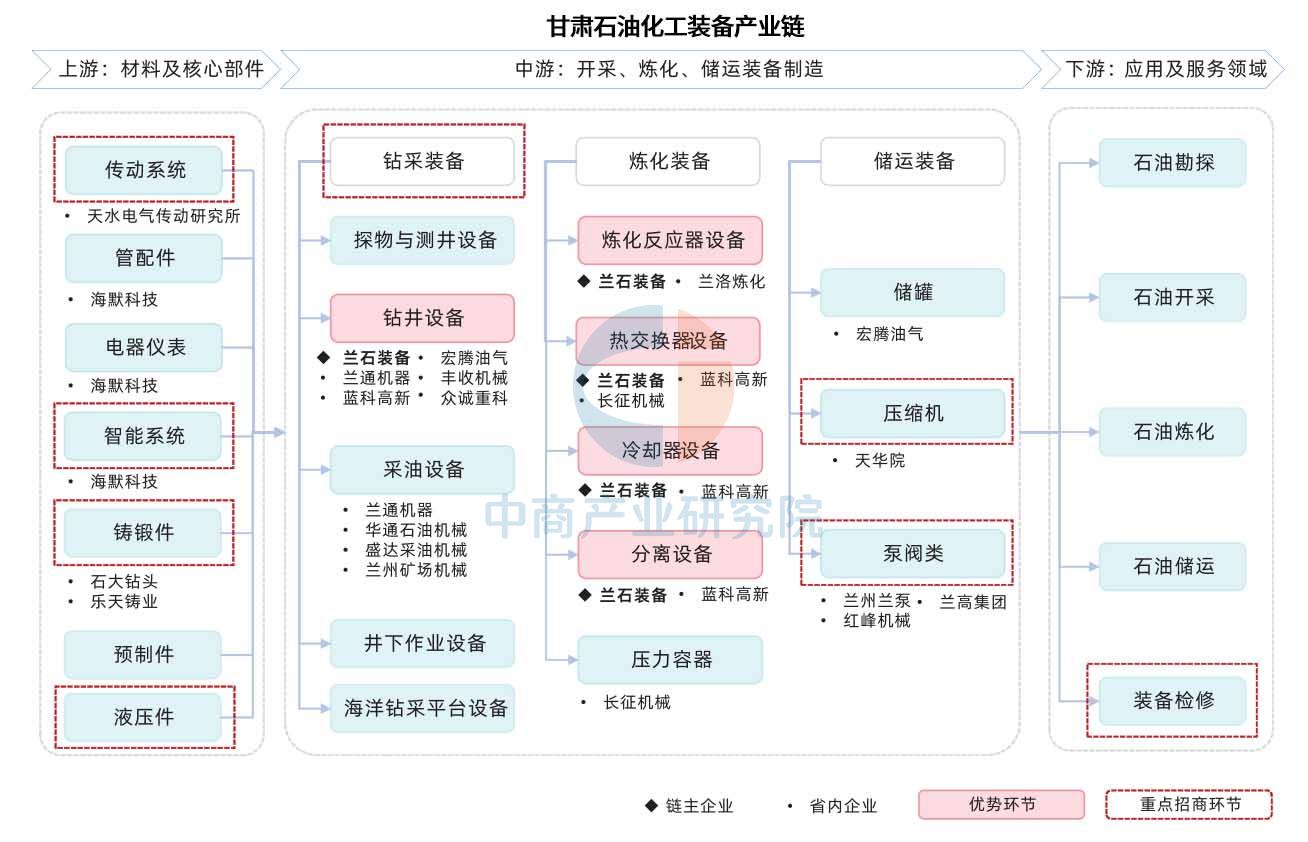 中商谍报网讯:甘肃成立了相对完整的财产系统,当前,甘肃石油化工配备财产链沉点招商环节为动弹系统、铸锻件、液压件,钻采设备、压缩机、泵阀类、配备检修。下逛使用及办事范畴包罗石油勘察、石油开采、石油炼化、石油储运、配备检修。财产链涵盖了配备、电工电气配备、矿用及工程配备、高端数控机床、现代农机配备、轨道交通配备等多个范畴。此中,